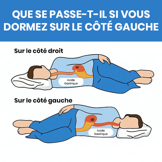 - Dormir sur ce côté peut faciliter le passage des aliments et des sucs digestifs, réduisant brûlures d’estomac et reflux gastro-œsophagien.