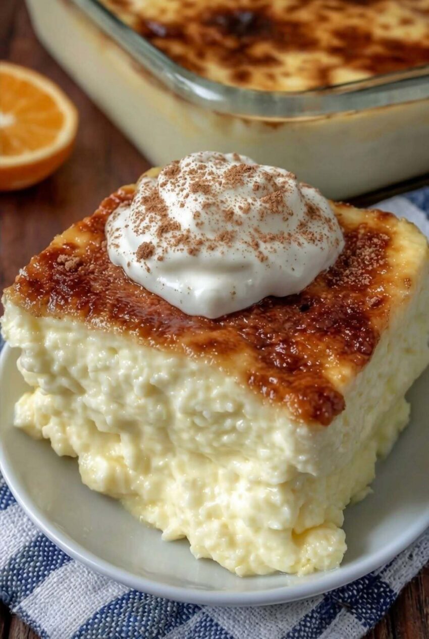 • Smooth, creamy custard made with milk, eggs, sugar, and vanilla.
